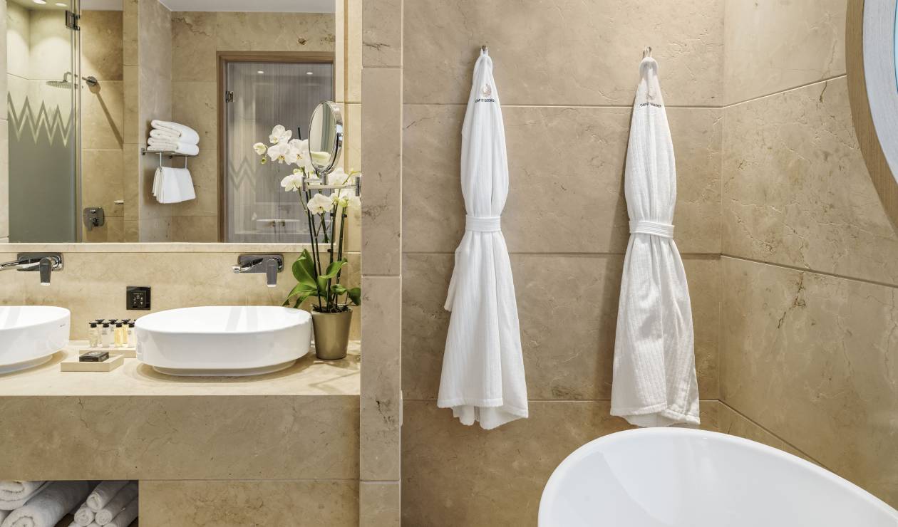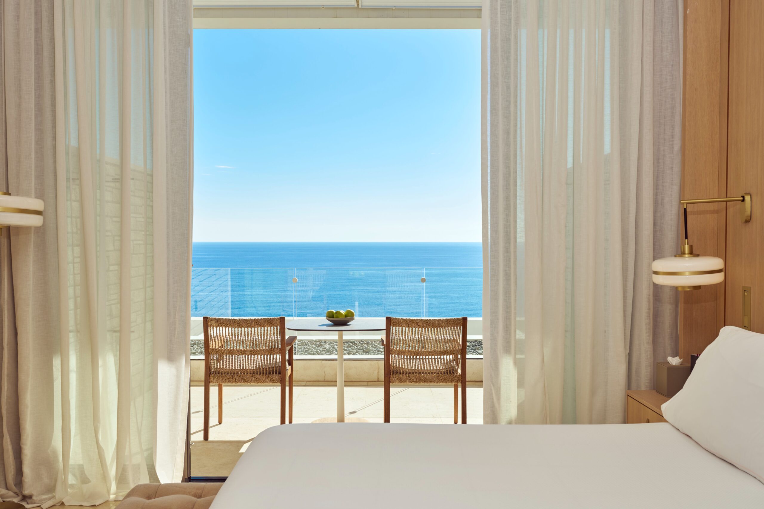 Boasting stunning panoramic sea views out over the vast expanse of Mediterranean from oversized panorama windows, the spectacular Cap Deluxe Rooms on the fourth and fifth floor are elegantly adorned in earth tones and a minimal riviera aesthetic to highlight the beautiful surrounding.