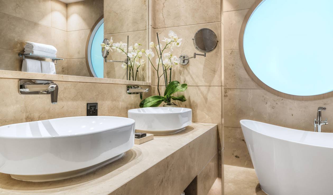 Soak in the endless blue from the spacious private balcony, or retreat from reality in the irresistible king size bed. These exquisite rooms also feature expansive bathrooms with opulent free-standing baths and double wash basins. A pull-out sofa bed allows for up to three guests to sleep comfortably.