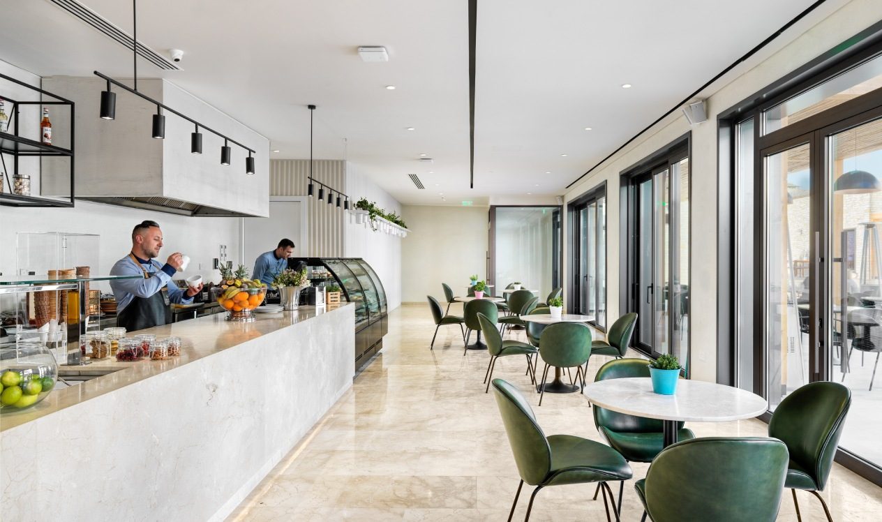 At Yeronisos restaurant, you can enjoy the breakfast experience you desire. Each morning a daily buffet breakfast offers mouth-watering flavours from the Mediterranean and international cuisine. You can also enjoy breakfast on the terrace or in the luxurious interior space which features white oak pillars shaped like trees and a Calcatta Gold marble buffet station.
